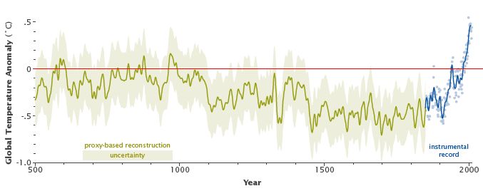 Utilisant des reconstructions de températures depuis 1500, Shaun Lovejoy estime que la théorie de la fluctuation naturelle ne tient pas la route pour expliquer le réchauffement constaté depuis plus d’un siècle, tout au plus permet-elle de comprendre de légères variations. L’étude publiée en avril comparait 4 périodes : 1500-1624, 1625-1749, 1750-1874 et 1880-2004. Alors que le réchauffement approche 1 degré depuis le début du 20è siècle, le climat n’a pas varié de plus de 0,5 degrés lors des 3 autres périodes, ou l’homme n’influençait pas encore le climat.
