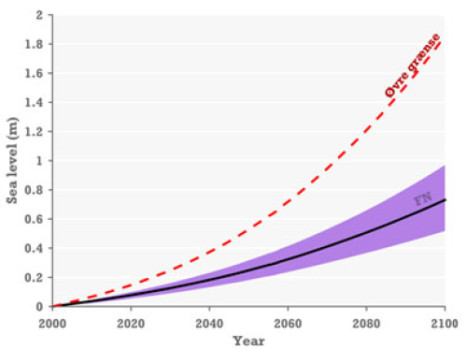 En conséquence, la contribution de certains glaciers de l’Antarctique et du Groenland pourrait aller au-delà des prévisions du GIEC. Sur la base de ces nouveaux calculs, les chercheurs ont pu évaluer les limites probables que devrait atteindre le niveau de la mer à la fin du 21è siècle. Les calculs montrent que le niveau océanique devrait augmenter de 80 centimètres dans l’hypothèse la plus probable. Mais dans le pire des cas, la hausse pourrait être de 180 cm. Cela reste cependant peu probable : Aslak Grinsted estime ce risque à moins de 5%. Il est donc quasiment impossible, selon lui, que l’élévation dépasse les 2 mètres. Ce chiffre pourrait en revanche être dépassé après 2100 puisque l’on s’attend à ce que l’élévation du niveau de la mer se poursuive pendant plusieurs siècles.