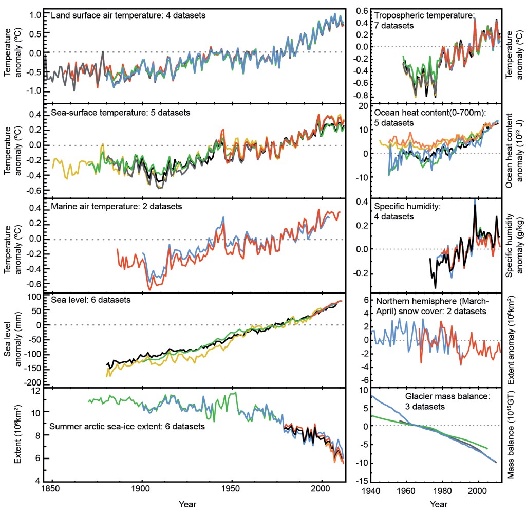 – Le réchauffement du système climatique est sans équivoque. L’atmosphère et l’océan se sont réchauffés, la couverture de neige et de glace a diminué, le niveau des mers s’est élevé et les concentrations des gaz à effet de serre ont augmenté.