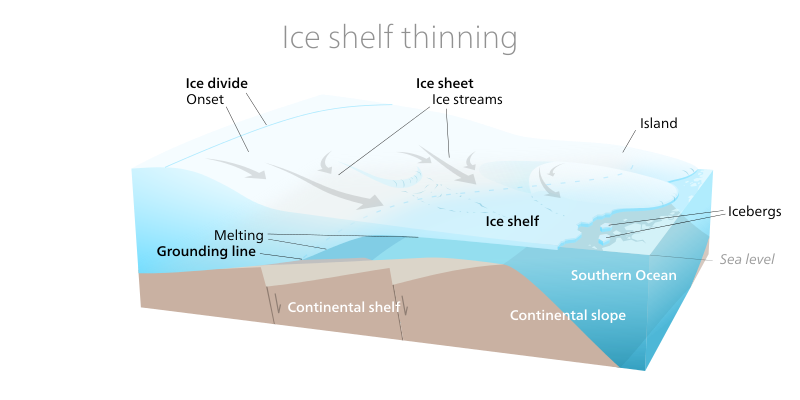 L’Antarctique de l’Ouest est particulièrement exposé en raison du bas niveau de son socle rocheux, situé sous le niveau de la mer, et donc exposé directement au réchauffement de l’océan austral. Avec le recul de la ligne d’échouage des glaciers, les plateformes de glace sont de moins en moins capables de contenir l’avancée des glaciers vers la mer. De plus, de l’eau s’infiltre entre les glaciers et le socle rocheux.