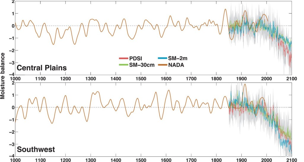 Benjamin Cook (NASA), Toby Ault (Université Cornell), et Jason Smerdon (Institut de la Terre Lamont-Doherty) se sont attelés à la tâche délicate de comparer les conditions depuis l’an 1000 aux prévisions des modèles simulant l’évolution future du climat à l’horizon 2100.