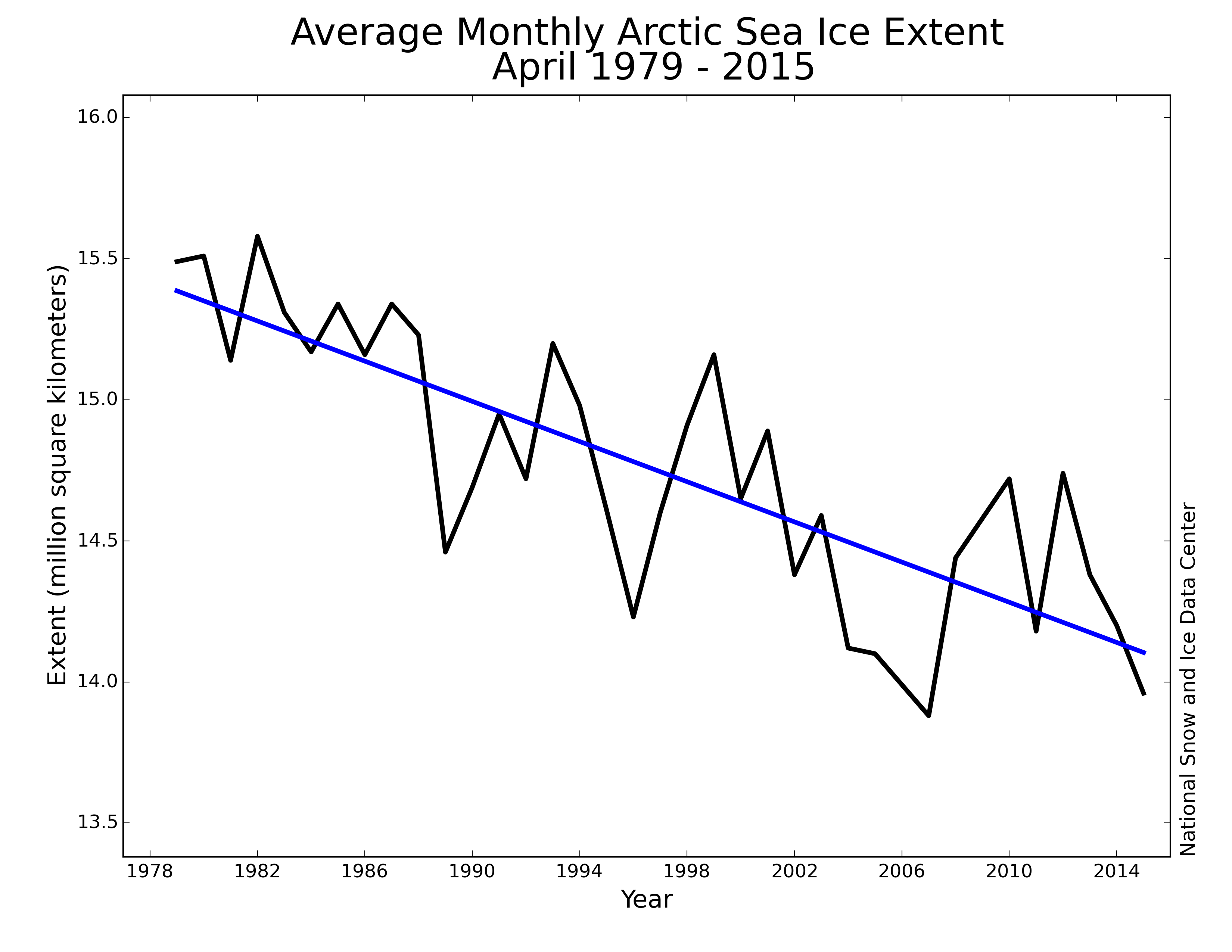 La glace de mer en Arctique atteint son extension minimale en septembre, à la fin de l’été dans l’hémisphère nord. Son extension maximum a lieu en mars. Cette année, l’extension hivernale des glaces de l’Arctique a été la plus faible jamais relevée depuis le début des mesures en 1979, selon le NSIDC. C’est donc à un niveau nettement inférieur à la moyenne que s’était s’amorcée la fonte printanière. La tendance s’est poursuivie au cours du mois d’avril 2015. En avril, le déclin de la glace de mer commence habituellement à accélérer, même si la perte totale sur le mois est relativement faible. Cette année, avril 2015 a été marqué par un déclin assez important la première semaine, une pause au milieu du mois et finalement un fort déclin la dernière semaine.
