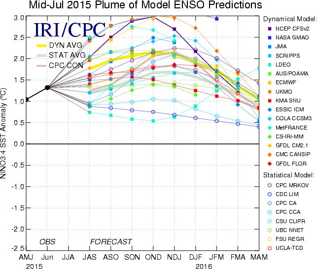 Les prévisions de plusieurs modèles de référence tablent désormais sur un El Niño des très forte intensité d’ici la fin 2015. La force du phénomène, qui a émergé en mars dernier, reste encore incertaine mais elle n’a cessé d’être réévaluée ces derniers mois. Plusieurs modèles suggèrent désormais que les niveaux exceptionnels enregistrés en 1982-83 et 1997-98 pourraient même être dépassés.