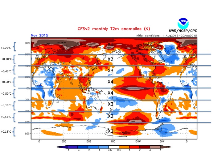 Le « problème », si c’en est un, est que l’on ne peut pas savoir exactement quelles seront les températures mensuelles fin 2015 : les anomalies ne sont disponibles que sur des cartes colorées de bleu pour les régions froides ou de rouge pour les régions chaudes. La légende en bas des cartes permet de préciser l’ampleur des anomalies. Ce que l’on peut voir, au moins grossièrement, c’est qu’il va faire chaud. Mais officiellement, la NOAA ne publie pas d’estimations chiffrées pour les mois à venir. J’ai quand même tenté de proposer une estimation basée sur l’analyse des couleurs représentant les anomalies. Cela n’est pas à proprement parler une prévision, plutôt la traduction d’une carte d’anomalies.