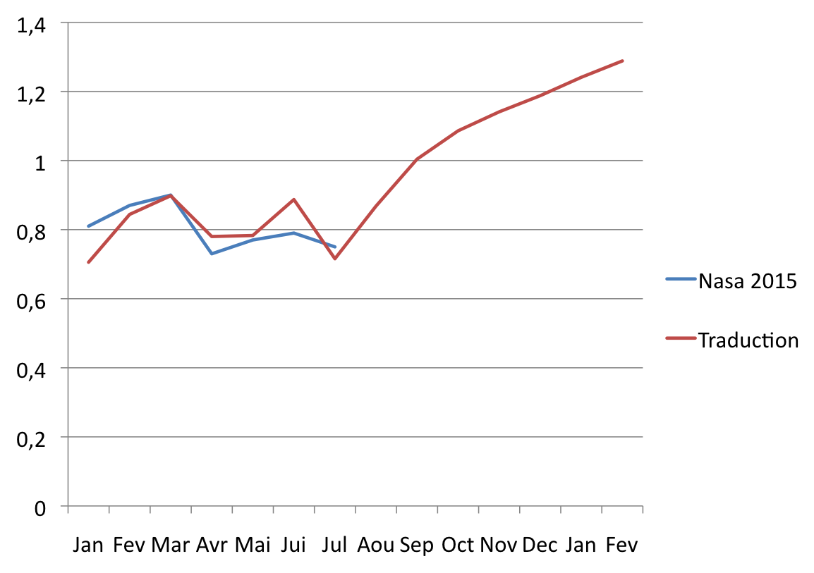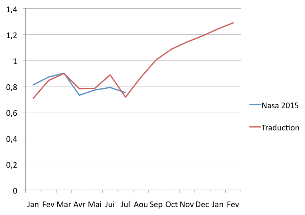 Voici maintenant les chiffres de la NASA comparés à ceux de la traduction NCEP CFSv2, sous forme de graphique :