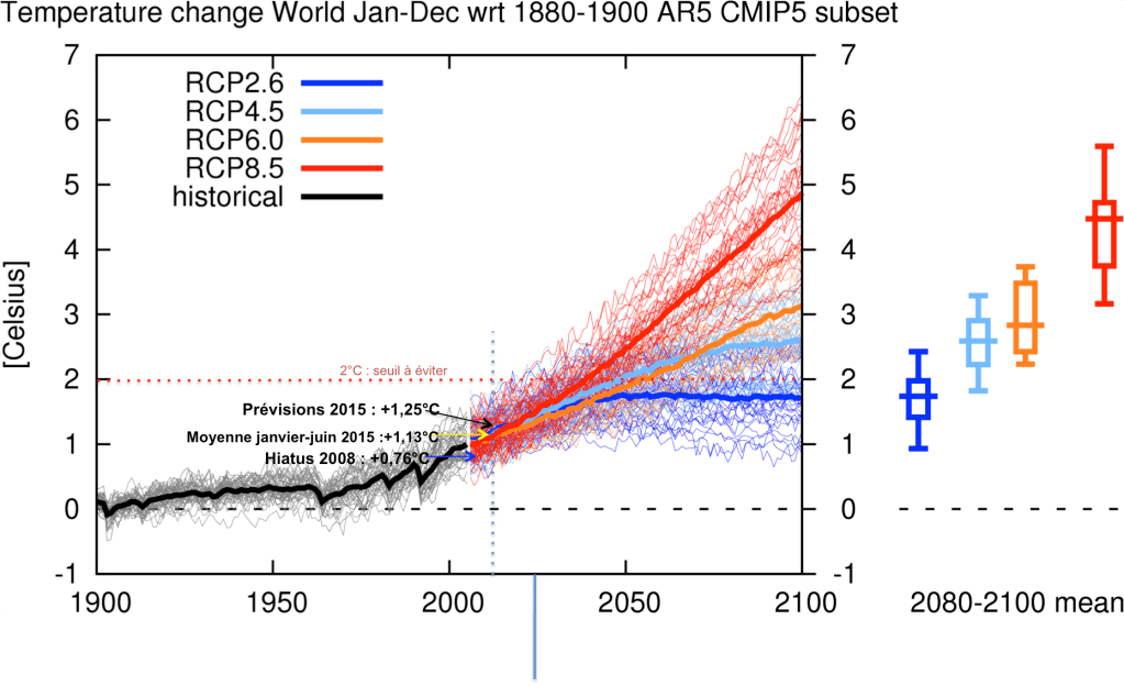L’ONU s’est fixée comme objectif de limiter le réchauffement climatique à 2°C par rapport à l’ère préindustrielle. En moyenne sur l’année 2014, la température relevée par la Nasa était déjà de 1°C supérieure à la période 1880-1900. Habituellement, la Nasa délivre ses chiffres d’anomalies par rapport à la moyenne 1951-1980 mais afin de comparer les observations aux modèles, il est préférable de prendre comme base 1880-1900, puisque les chiffres de la Nasa remontent jusqu’à 1880. Cela permet de voir on nous sommes par rapport à l’objectif de 2°C et aux prévisions basées sur les différents scénarios de gaz à effet de serre (RCP 2.6 à RCP 8.5).