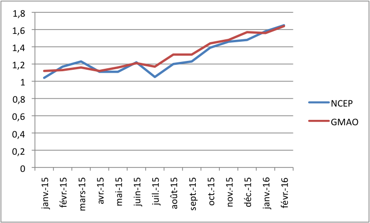 Après le record de chaleur de 2014, les températures ont encore grimpé en 2015 à cause du phénomène El Niño : sur janvier-juin, l’anomalie a été de +1,13°C (par rapport aux archives sur la première partie de l’année). Si l’on tente d’interpréter les prévisions des cartes colorées de la Nasa et de la NOAA pour obtenir une obtenir une prévision pour la fin de l’année 2015 (comme je l’ai fait ici), on arrive même à un chiffre de +1,25°C par rapport à 1880-1900, voir au-delà… Mais cette prévision est hautement spéculative, elle ne repose que sur une tentative de traduire des anomalies vues sur les cartes colorées des modules à moyen terme NCEP CFSv2 et GMAO. La Nasa et la NOAA ne sont nullement responsables de ces prévisions chiffrées – il ne s’agit que d’une modeste tentative de l’auteur de ce blog – et il faut évidemment les prendre davantage comme une indication de tendance. Ce sont des cartes de ce type que j’ai tenté de traduire :