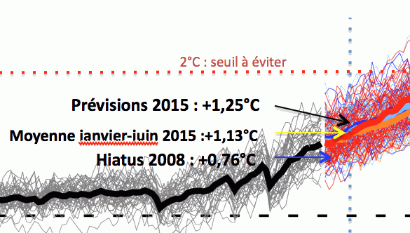 Avant de parler des prévisions pour 2015, il faut rappeler que le réchauffement a été moins marqué entre 1999 et 2012. Même s’il y a eu des records de chaleur, le rythme de la hausse a été moins élevé que dans les années 1990. Un exemple : 2008, la plus froide des 10 dernières années, s’est soldée par +0,76°C par rapport à 1880-1900. Ce niveau reste dans la fourchette (basse) de probabilité des scénarios du GIEC mais force est de constater qu’il est inférieur à la prévision centrale du CMIP5, le modèle climatique de prévision à long terme le plus récent et donc normalement le plus fiable. Depuis le début des années 2000, des critiques ont sans surprise émergé quand à la capacité des modèles à prédire l’augmentation des températures. En fait, il est très probable que ce ralentissement soit dû aux conditions plutôt froides qui ont prévalu à la surface du Pacifique. Certains ont pensé que cet argument n’était qu’une excuse pour expliquer la stagnation des températures. Le phénomène El Niño actuel montre que cette pause climatique était bien due à la variabilité naturelle et qu’elle ne remet pas en cause les connaissances concernant l’impact des gaz à effet de serre. On peut le voir si on compare le niveau atteint en 2014 et en 2015 : on est en parfait accord avec les modèles.