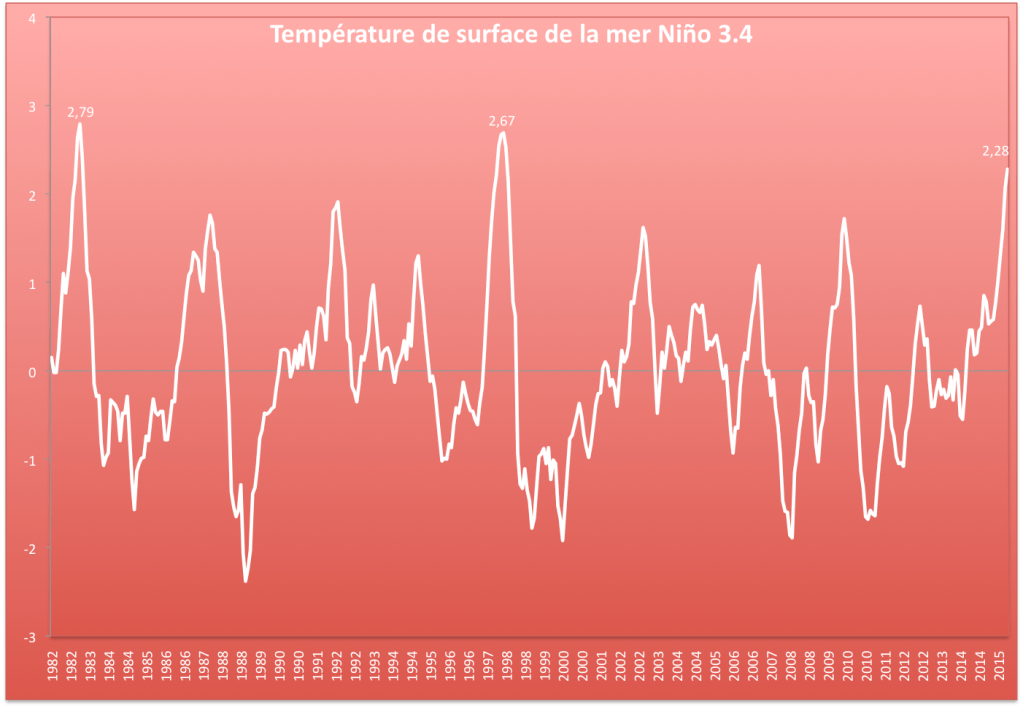 Si le niveau observé en octobre 2015 est à un niveau record, les températures de surface de la mer dans la région 3.4 n’ont pas encore atteint le pic enregistré en 1982-83 et 1997-98, où l’anomalie avait grimpé à 2,79°C et 2,67°C en moyenne mensuelle. Mais le phénomène 2015 n’a peut-être pas encore atteint son intensité maximum et le réchauffement pourrait se poursuivre dans la région 3.4 en hiver.