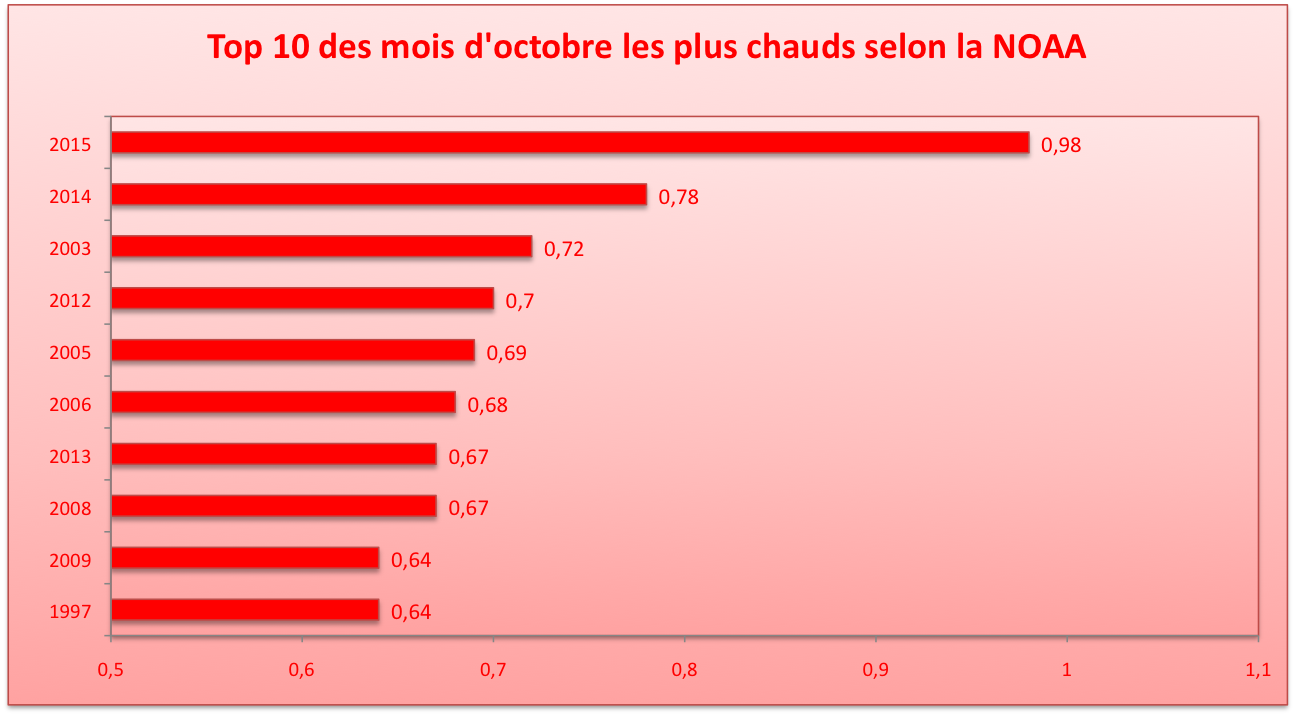 Résultat : octobre 2015 est de loin le plus chaud des annales avec un écart de +0,98°C par rapport à la moyenne du 20è siècle. Le précédent record établi en 2014, pourtant significatif (+0,78°C), n’aura donc pas fait long feu. La NOAA confirme ainsi les chiffres de la JMA et surtout ceux de la Nasa qui vient d’annoncer un record spectaculaire de +1,04°C ! La Nasa se base par rapport à la moyenne 1951-1980 mais un écart à la moyenne du 20è siècle donnerait exactement le même chiffre.