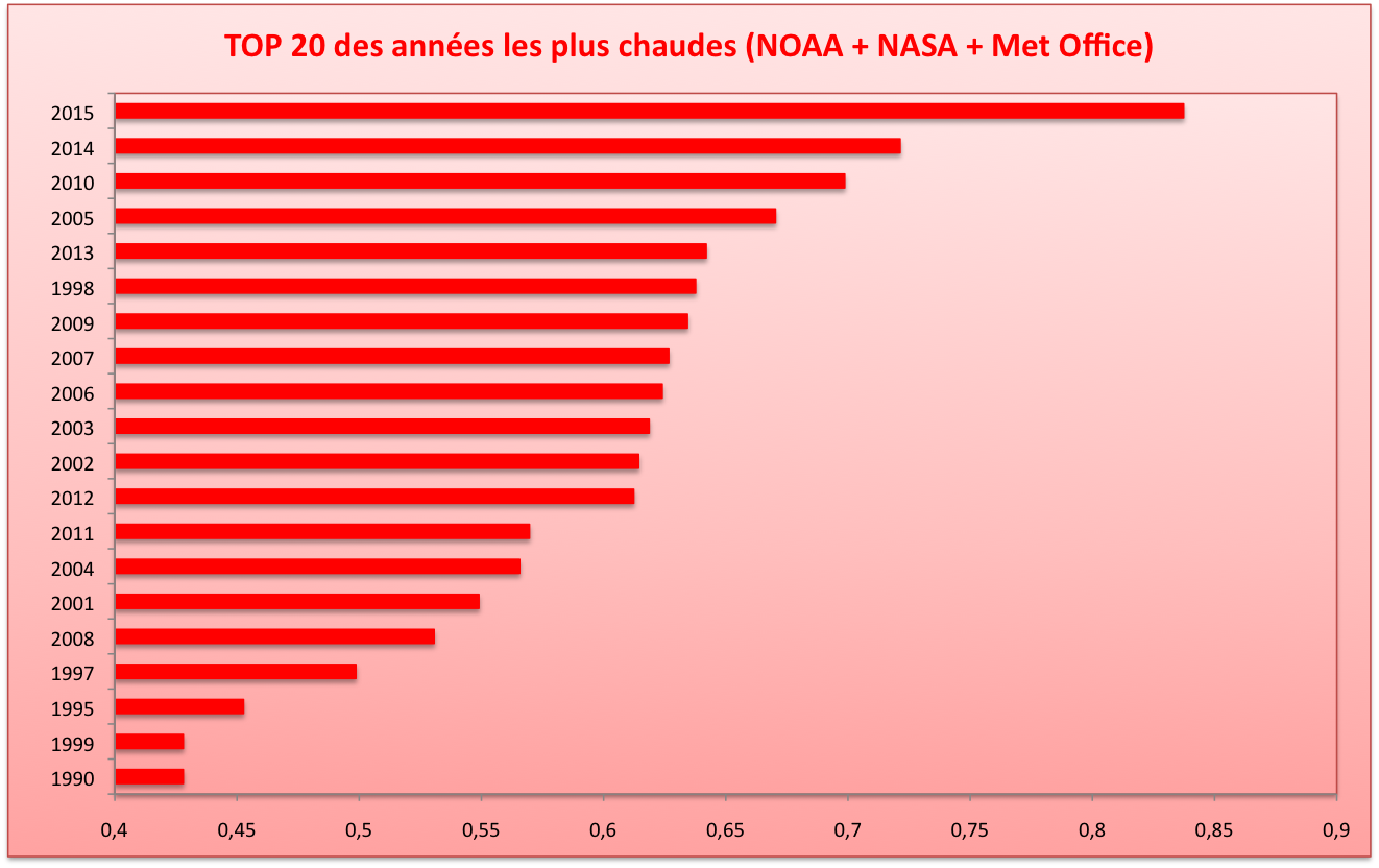 Les chiffres de la NASA et de la NOAA sont comparables à ceux du Met Office. Sur les 20 années les plus chaudes depuis 1880, pas moins de 15 ont été relevées après l’an 2000 ; les 5 autres après 1990.
