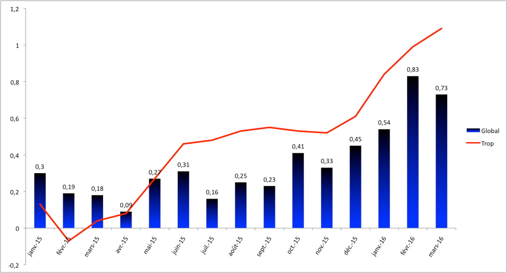 Par rapport à la moyenne du 20è siècle, l’anomalie est de +1,22°C (si l’on ajoute les chiffres de la NASA à la moyenne 1981-2010 d’UAH). En février, l’anomalie avait été de +1,32°C. Tous les mois de 2016 ont pour le moment connu une anomalie supérieure à 1°C alors qu’avant cette année, cette marque n’avait été dépassée qu’en 1998, l’année du super El Niño.
