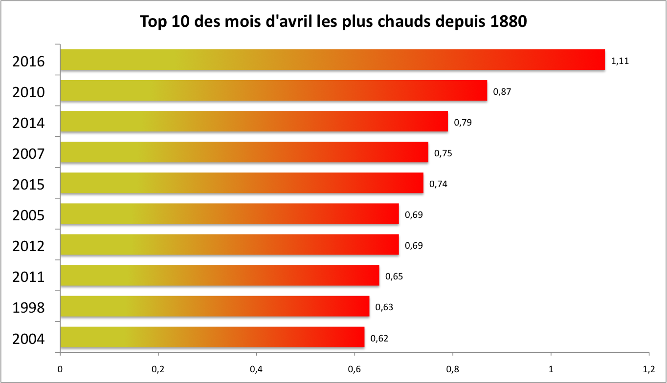 Depuis le début de l’année (janvier-avril), l’anomalie est de +1,21°C au-dessus de la moyenne 1951-1980, ce qui aussi un record pour la période, largement devant le 2è plus fort écart à la moyenne observé en 2015 avec +0,83°C. L’année 2016 a donc désormais toutes les chances d’établir un nouveau record après celui de 2015. Quoi qu’il en soit, 2016 éjectera 1998 du Top 10 des années les plus chaudes malgré le phénomène El Niño qui avait considérablement réchauffé la planète à l’époque. Les 10 années les plus chaudes depuis 1880 devraient donc toutes être des années post-2000 quand les chiffres officiels de 2016 auront été dévoilés.