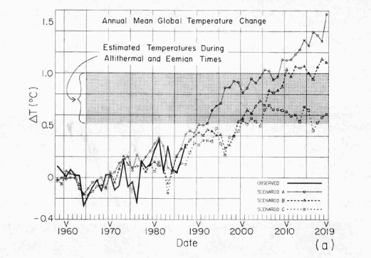 Cette année 1988, James Hansen a également publié une étude dans le Journal of Geophysical Research, dans laquelle il présentait les résultats d’un des premiers modèles climatiques. Trois scénarios d’émissions de gaz à effet de serre y étaient exposés, A, B et C, du plus émetteur au moins émetteur. Celui qui se rapprochait le plus des émissions actuelles de CO2 était le scénario B qui tablait pour 2016 sur une concentration de 408 ppm, soit un petit peu plus qu’aujourd’hui (environ 404 ppm sur les premiers mois de 2016). Le scénario A tablait sur 412 ppm et le C sur 369 ppm.