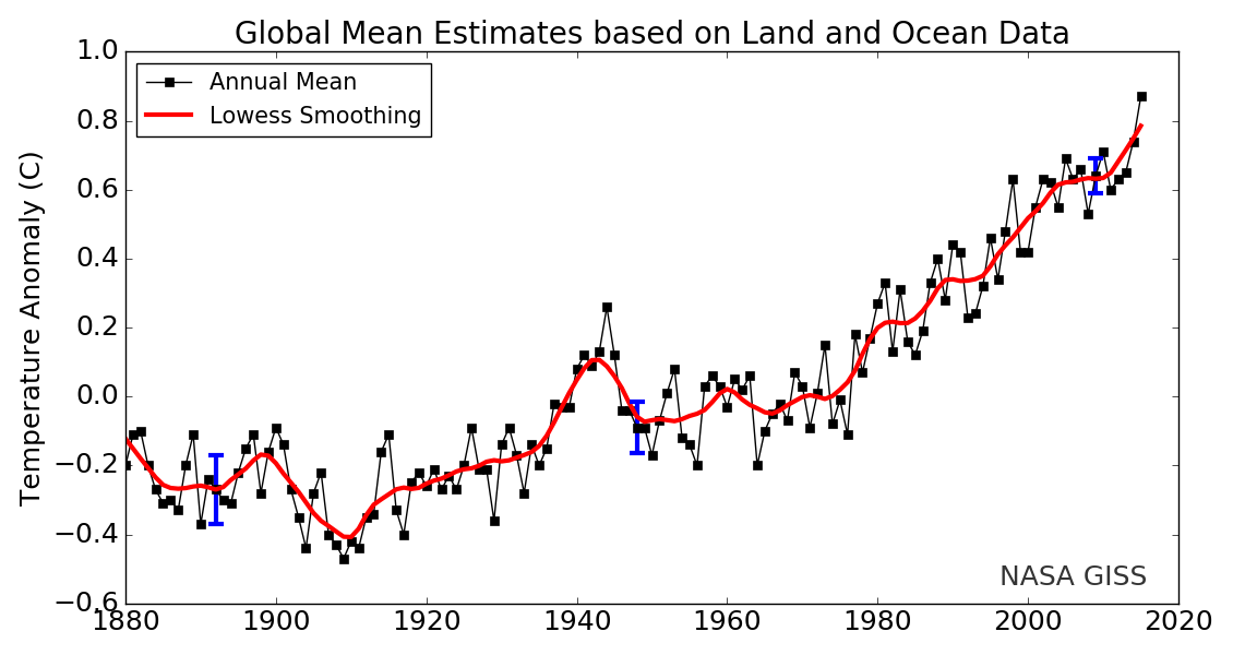 Les données brutes de la NASA montrent un réchauffement de +0,92°C pour la période de cinq ans récente de 2010-2014 par rapport à 1900-1904 alors que le calcul de Kosaka et Xie donne un réchauffement anthropique beaucoup plus élevé depuis 1900 avec +1,2°C après correction de l’effet de la variabilité naturelle.
