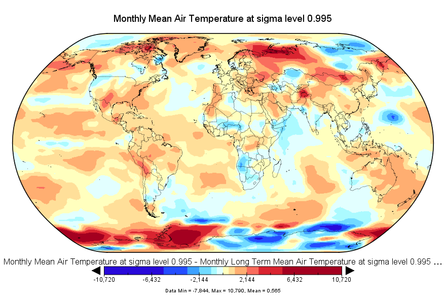 Comme on peut le voir sur la carte ci-dessous ci-dessous, les anomalies de températures ont été moins élevées au niveau de l’Arctique qu’en début d’année mais globalement les écarts restent nettement positifs à la surface de la planète. On note des températures très contrastées en Antarctique. Ce continent pourrait être l’une des régions du monde à connaître les anomalies positives les plus importantes dans les prochains mois, si l’on en croit les prévisions du modèle NCEP CFSV2.
