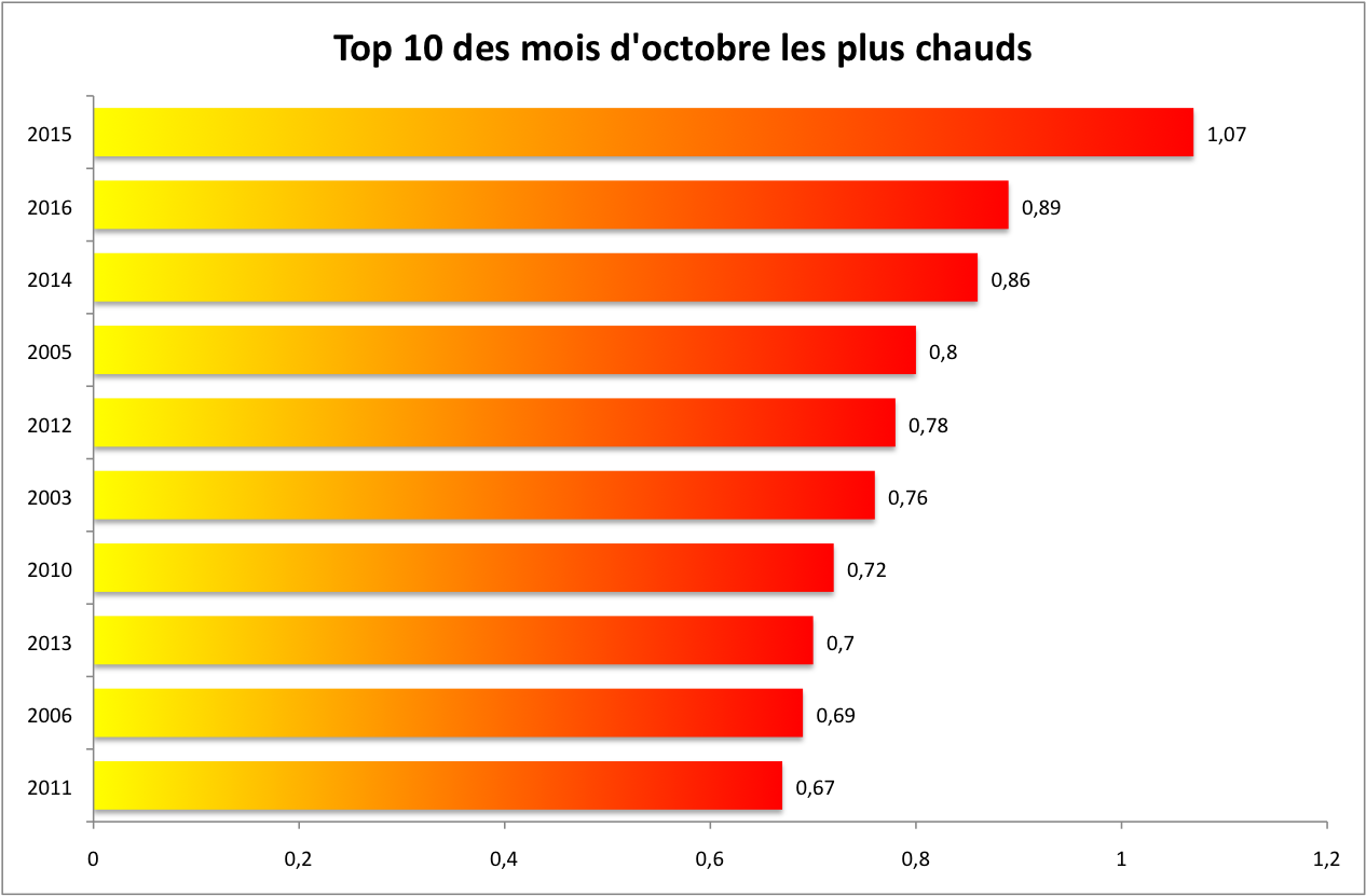 L’année 2016 va battre le record de chaleur établi en 2015. Sur la période janvier-octobre, l’anomalie est de +1,02°C au dessus de la moyenne 1951-1980, loin devant les 0,83°C de 2015 et les +0,75°C de 2014.