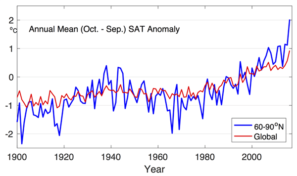 Entre octobre 2015 et septembre 2016, l’anomalie de température à la surface des terres situées au-delà de 60° Nord a été de +2,2° C par rapport à la moyenne 1981-2010, selon le dernier Arctic Report Card. C’est de loin la moyenne la plus élevée depuis le début des mesures en 1900. Par rapport au début du XXe siècle, l’augmentation atteint 3,5°C. Des records mensuels de chaleur ont été battus en janvier, février, octobre et novembre 2016, avec de profond impacts sur l’Arctique.