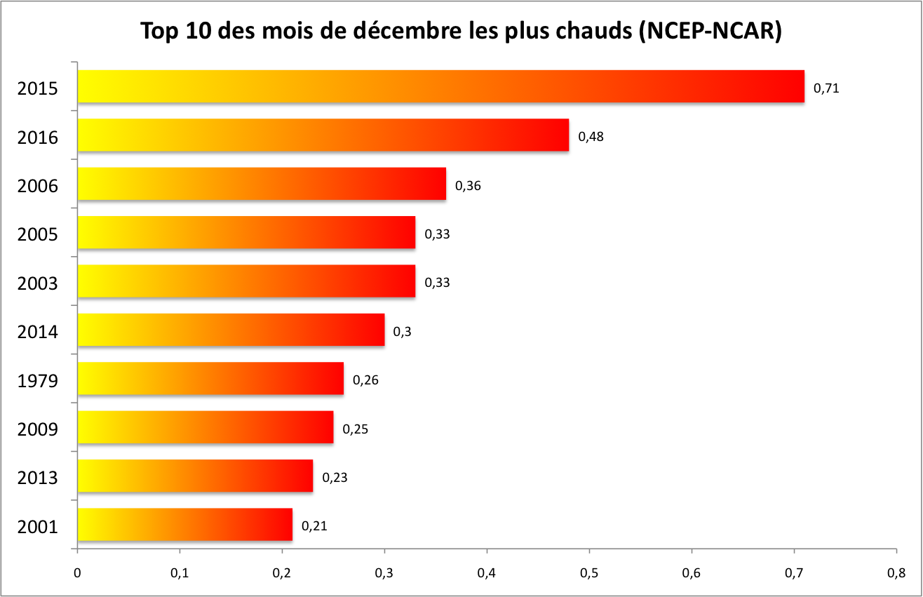 La planète a connu en 2016 son deuxième mois de décembre le plus chaud depuis le début des mesures NCEP-NCAR. On retiendra surtout que l’année 2016 atteint un niveau record, très loin devant une année 2015 pourtant exceptionnelle.