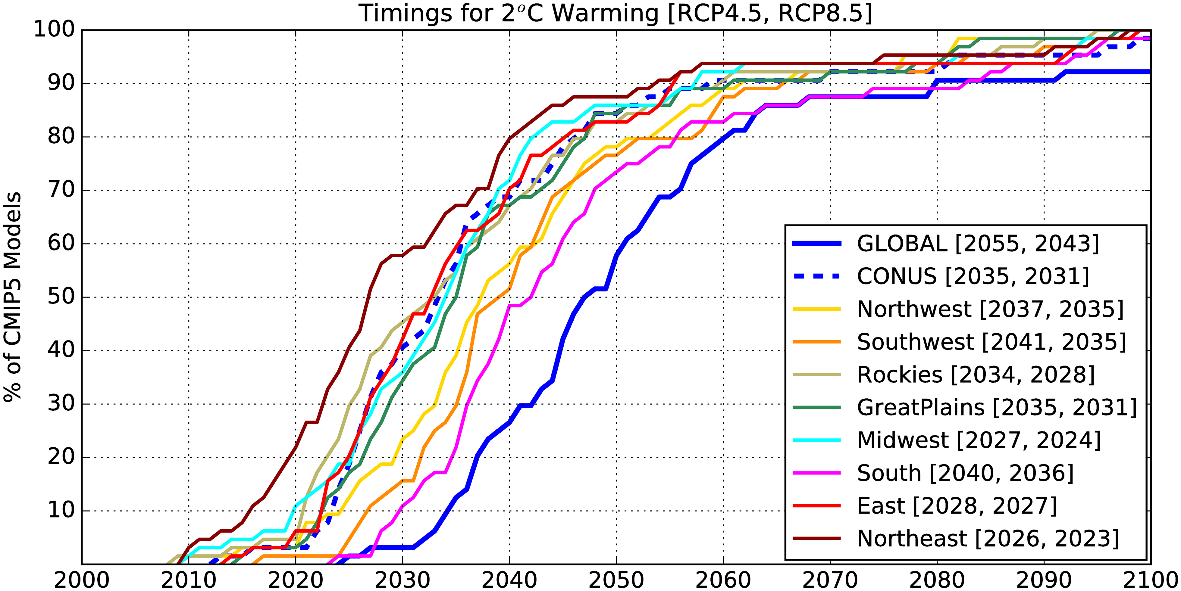 Concernant les États-Unis dans leur ensemble, le franchissement des 2°C ne se produirait que de 1 à 6 ans après avec RCP4.5 par rapport à RCP8.5. Un graphique intéressant a été publié sous Creative Commons par les auteurs de l’étude. On peut y voir le « timing du réchauffement de 2°C » pour le globe, les USA et huit grandes régions des CONUS. Parmi les huit régions des Etats-Unis passées au crible, c’est le Nord-Est qui est censé se réchauffer le plus avec +3°C au milieu du siècle, au moment où le monde franchira les +2°C. Un exemple : pour 50% des projections RCP 8.5, le nord-est atteindra les 2°C en 2023 :