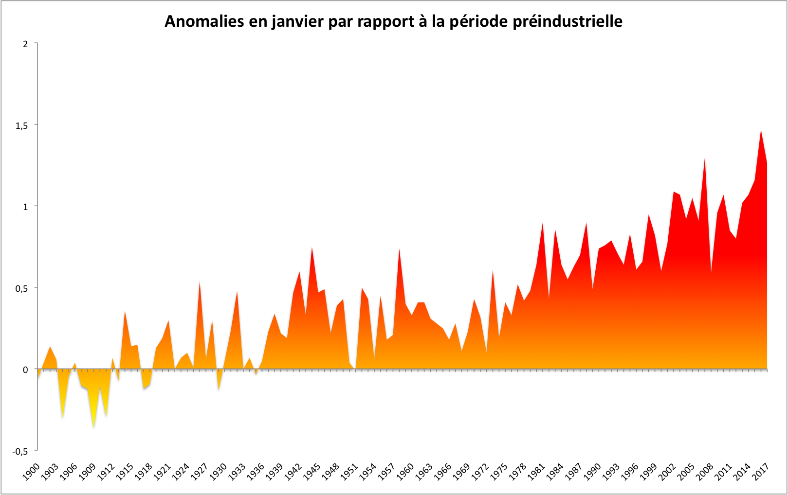 Les chiffres publiés par la NASA sont relatifs à la période 1951-1980 mais on peut aussi calculer les anomalies par rapport aux données les plus lointaines, à savoir la période 1880-1899, que l’on peut considérer comme représentative de l’ère préindustrielle, où au moins comme une période où les émissions de gaz à effet de serre anthropiques n’avaient pas encore profondément modifié le climat. Cela permet de comparer la situation actuelle aux objectifs que sont fixés les Etats pour contenir le réchauffement climatique en-dessous du niveau considéré comme dangereux. Par rapport à la période 1880-1899, l’anomalie a été de 1,26°C en janvier 2017. Lors de la COP21 de Paris, un accord a été obtenu pour contenir le réchauffement sous les 2°C, voire 1,5°C si possible. Ce dernier niveau avait été frôlé en janvier 2016 avec +1,47°C.
