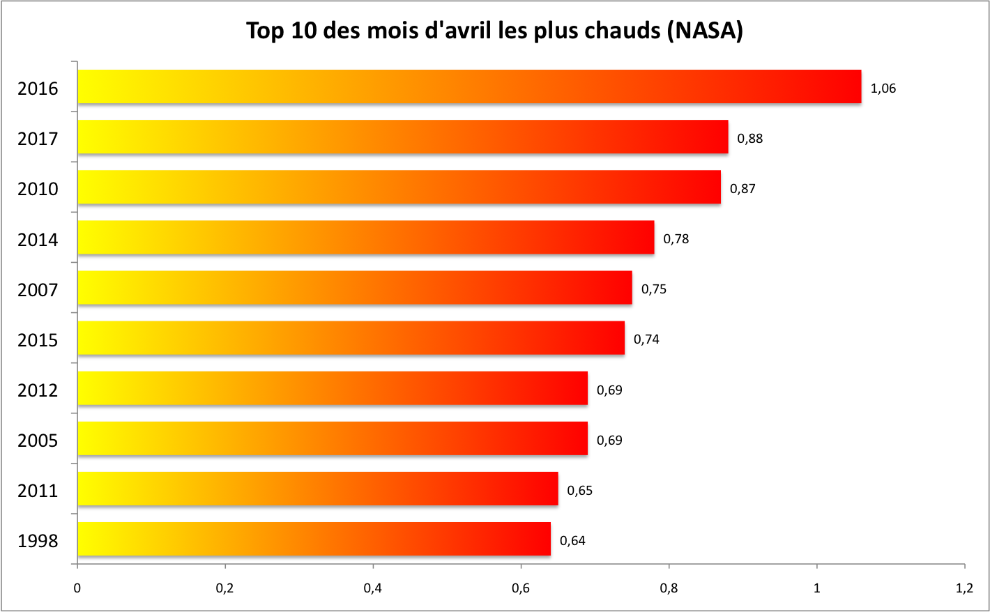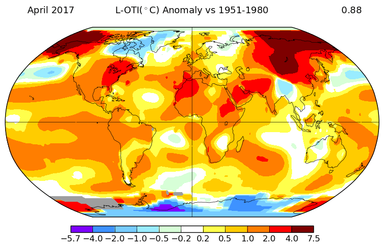 Le mois d’avril 2017 a été le deuxième plus chaud depuis le début des relevés en 1880, selon la NASA. Le premier tiers 2017 est à +0,99°C, un an après El Niño. C’est au-dessus de la moyenne 2016 sur 12 mois.