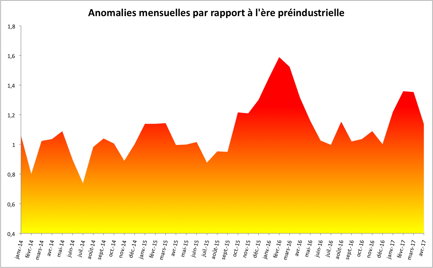 Les chiffres publiés par la NASA sont relatifs à la période 1951-1980 mais on peut aussi calculer les anomalies par rapport aux données les plus lointaines, à savoir la période 1880-1899, que l’on peut considérer comme représentative de l’ère préindustrielle, où au moins comme une période où les émissions de gaz à effet de serre anthropiques n’avaient pas encore profondément modifié le climat. Cela permet de comparer la situation actuelle aux objectifs que sont fixés les Etats pour contenir le réchauffement climatique en-dessous du niveau considéré comme dangereux. Par rapport à la période 1880-1899, l’anomalie a été de 1,14°C en avril 2017. Lors de la COP21 de Paris, un accord a été obtenu pour contenir le réchauffement sous les 2°C, voire 1,5°C si possible. Ce dernier niveau avait été dépassé en février 2016 avec +1,6°C.