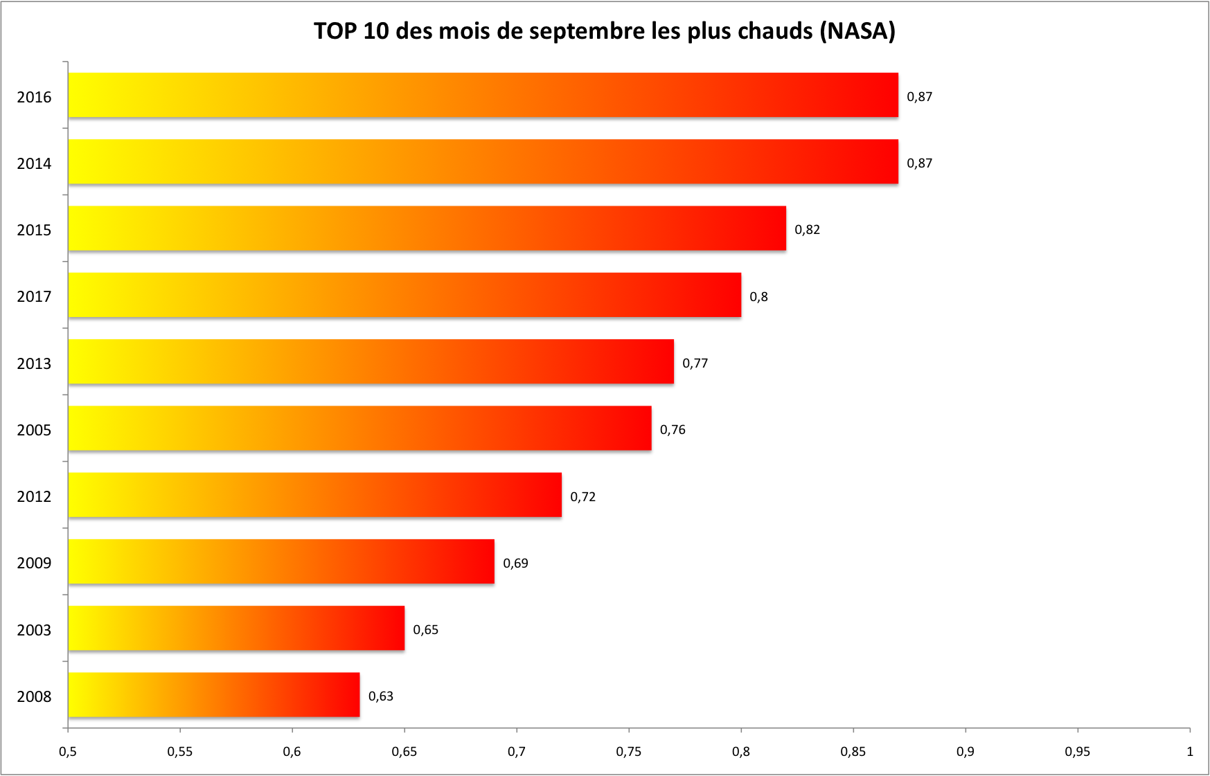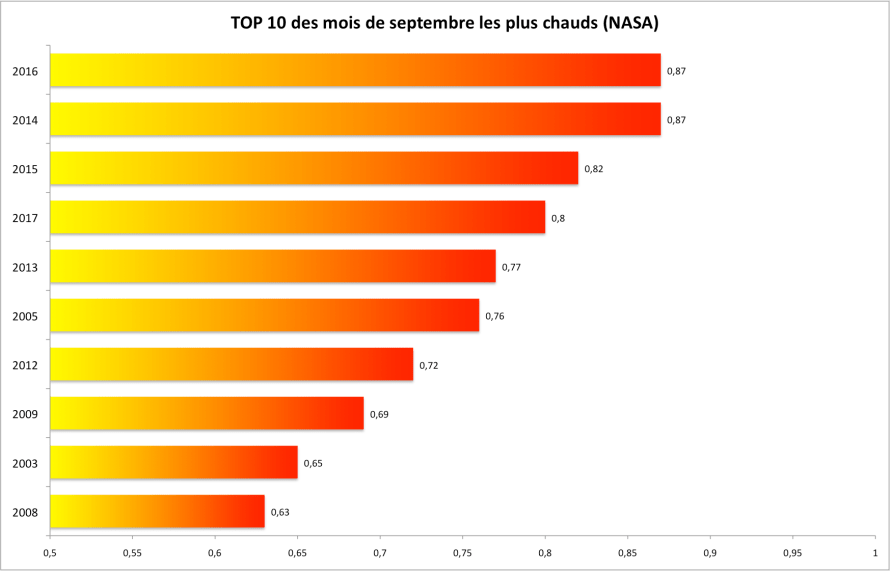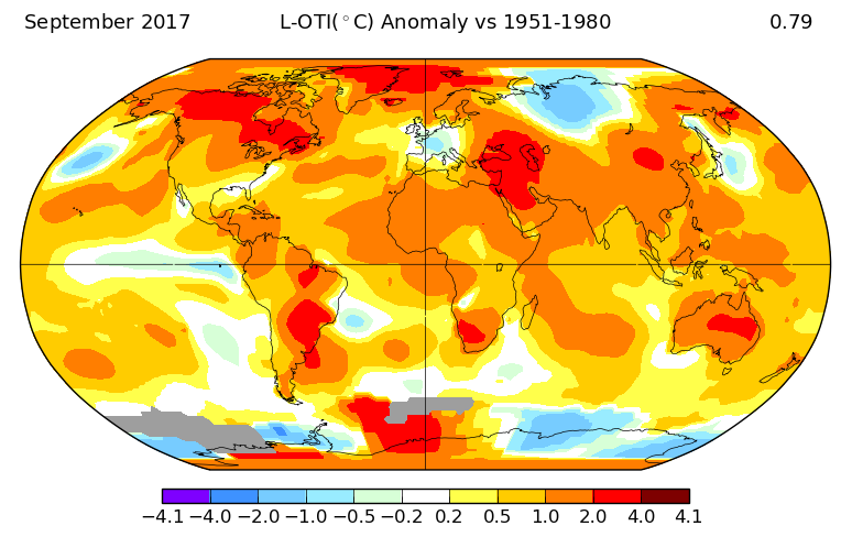 Le mois de septembre 2017 a été le quatrième plus chaud depuis le début des relevés de la NASA en 1880.