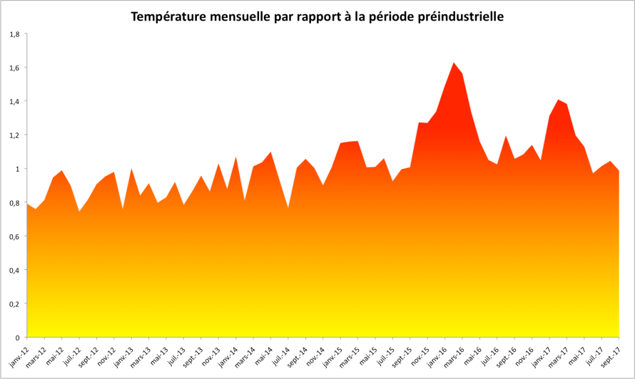 2017 sera la troisième année la plus chaude si la moyenne sur les trois derniers mois est inférieure +0,75°C.
