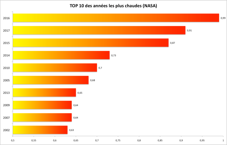 Pour la température globale, janvier-septembre 2017 se situe entre la moyenne de 2016 et celle de 2015 sur 12 mois. La NASA relève +0,91°C sur les neuf premiers mois de l’année contre +0,99°C sur 12 mois lors de l’année record de 2016. On notera que les quatre années les plus chaudes (2017 étant limitée à janvier-septembre) sont dans l’ordre 2016, 2017, 2015 et 2014.