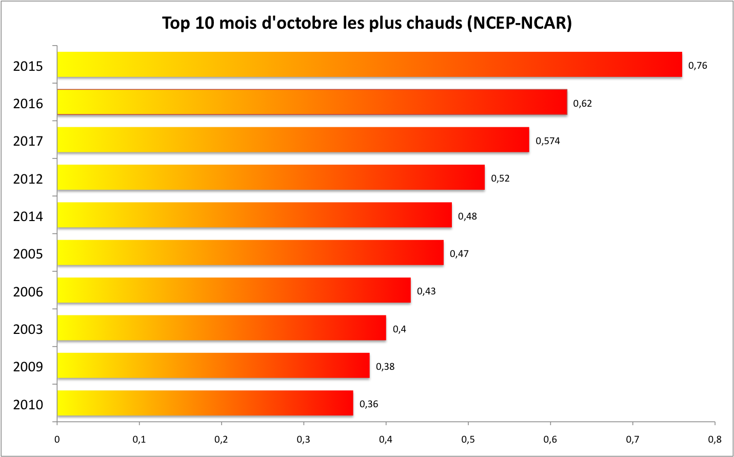 Le mois d’octobre 2017 est le troisième plus chaud des archives NCEP-NCAR. Avec +0,574°C au-dessus de la moyenne 1981-2010, l’anomalie mensuelle grimpe de 0,05°C par rapport à septembre. Elle se situe – encore – derrière 2015 (+0,76°C) et 2016 (+0,62°C).