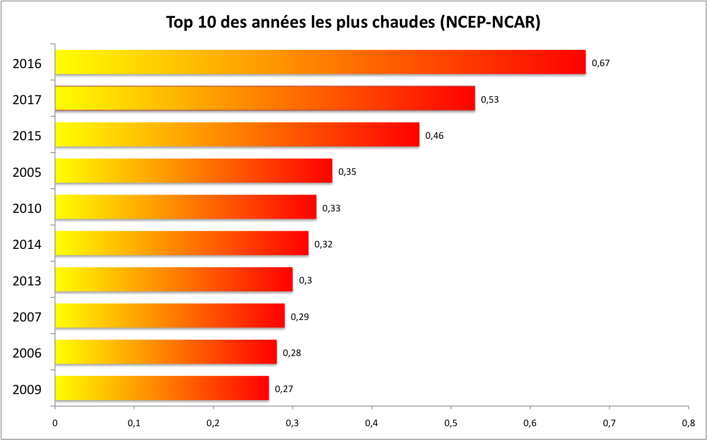 La moyenne sur les 12 mois de 2016 devance janvier-octobre 2017 avec +0,67°C contre +0,53°C. Il n’y a désormais plus aucun risque de voir 2017 battre le record de 2016. Il faudrait une moyenne de 1,37°C sur les deux derniers mois de l’année, ce qui n’est jamais arrivé. Et il faudrait une moyenne de 0,11°C sur novembre-décembre pour que 2015 passe devant 2017. 2017 devrait donc bien être la deuxième année la plus chaude des relevés NCEP-NCAR.