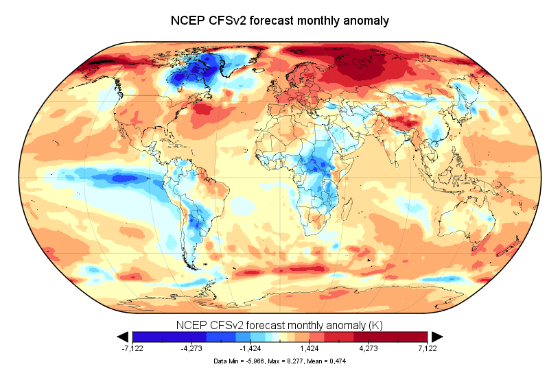 Cette page fournit des anomalies climatiques mensuelles prévues par le modèle NCEP CFSv2 pour le mois de décembre et rappelle les prévisions des mois précédents. Les anomalies mensuelles sont basées sur la période de 1982-2010 (proche de la période de référence habituelle, 1981-2010) sans aucun ajustement. Les chiffres sont mis à jour quotidiennement par la NOAA et font donc l’objet de révisions très régulières.