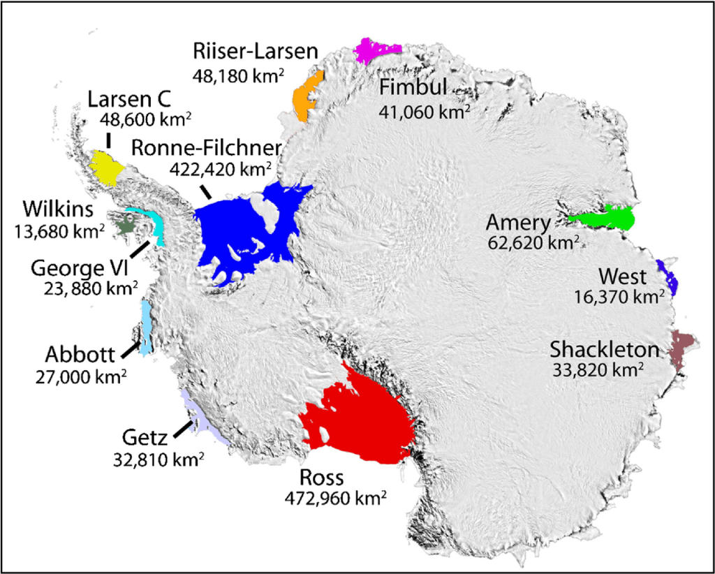 Ainsi, les plateformes de glace Filchner-Ronne et Ross ont de forts effets de contrefort sur presque toute la ligne d’ancrage, ce qui est particulièrement inquiétant car c’est aussi l’emplacement où la fonte est la plus importante.