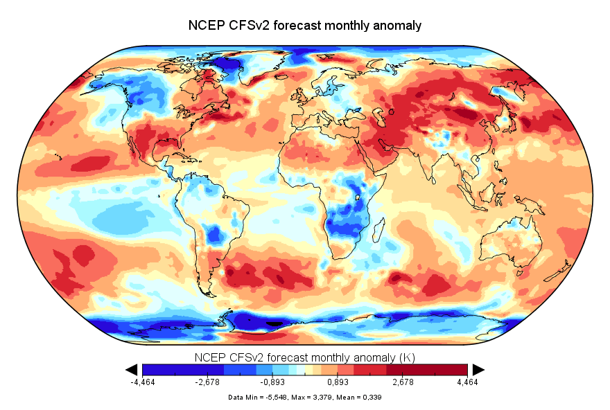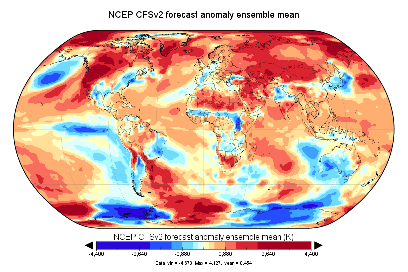 Cette page fournit des anomalies climatiques mensuelles prévues par le modèle NCEP CFSv2 pour le mois d’avril 2018 et rappelle les prévisions des mois précédents. Les anomalies mensuelles sont basées sur la période de 1982-2010 (proche de la période de référence habituelle, 1981-2010) sans aucun ajustement. Les chiffres sont mis à jour quotidiennement par la NOAA et font donc l’objet de révisions très régulières.