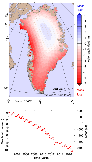 La carte montre les derniers changements de masse dérivés des données des satellites GRACE. Source : Polar Portal.