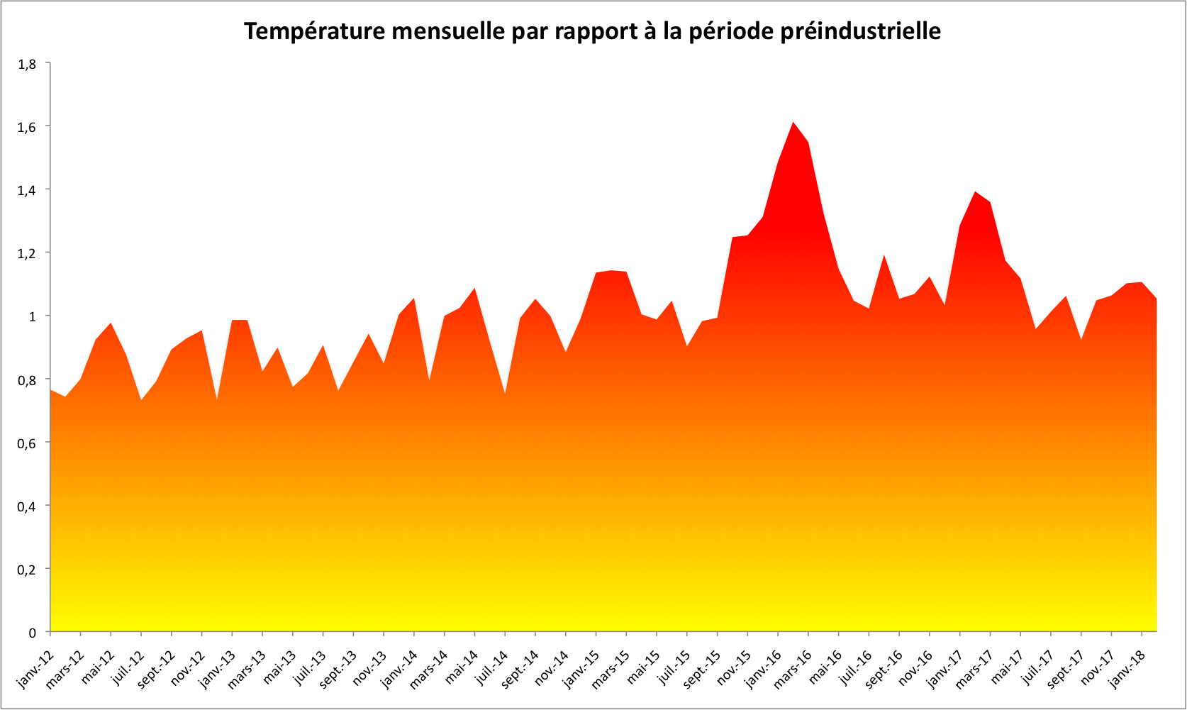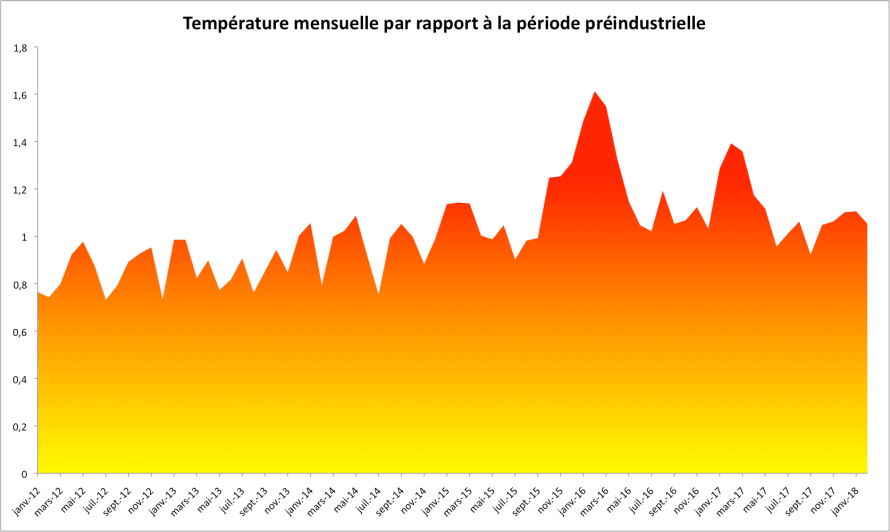 Les chiffres publiés par la NASA sont relatifs à la période 1951-1980 mais on peut aussi calculer les anomalies par rapport aux données les plus lointaines, à savoir la période 1880-1899, que l’on peut considérer comme représentative de l’ère préindustrielle, où au moins comme une période où les émissions de gaz à effet de serre anthropiques n’avaient pas encore profondément modifié le climat. Cela permet de comparer la situation actuelle aux objectifs que sont fixés les Etats pour contenir le réchauffement climatique en-dessous du niveau considéré comme dangereux. Par rapport à la période 1880-1899, l’anomalie a été de 1,13°C en mars 2018. Lors de la COP21 de Paris, un accord a été obtenu pour contenir le réchauffement sous les 2°C, voire 1,5°C si possible. Ce dernier niveau avait été dépassé en février 2016 avec +1,6°C.