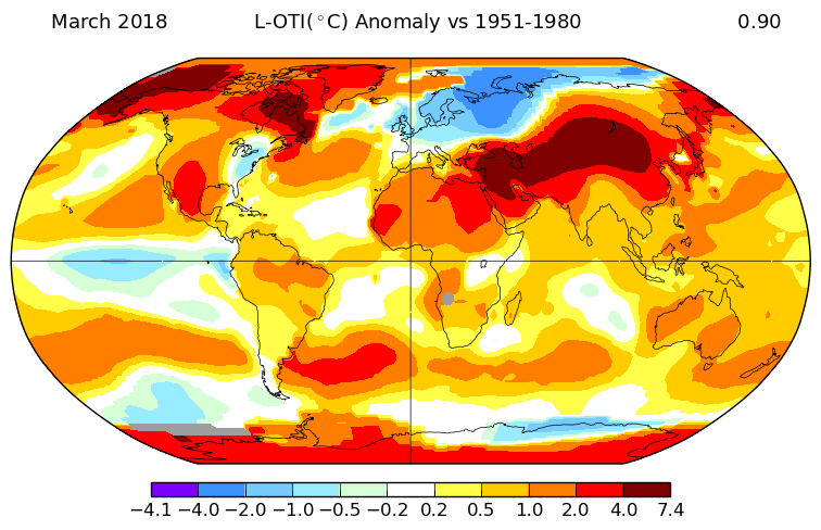 Toujours sous l’influence de La Niña, le mois de mars 2018 a été le sixième plus chaud depuis le début des relevés de la NASA en 1880.