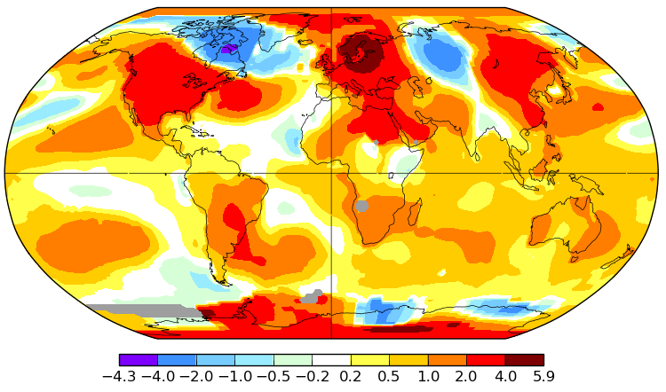 Avec +0,82°C au-dessus de la moyenne 1951-1980, l’anomalie relevée en mai 2018 baisse légèrement par rapport à avril (+0,85°C). Les cinq mois de mai les plus chauds depuis 1880 ont été observés… Ces cinq dernières années.
