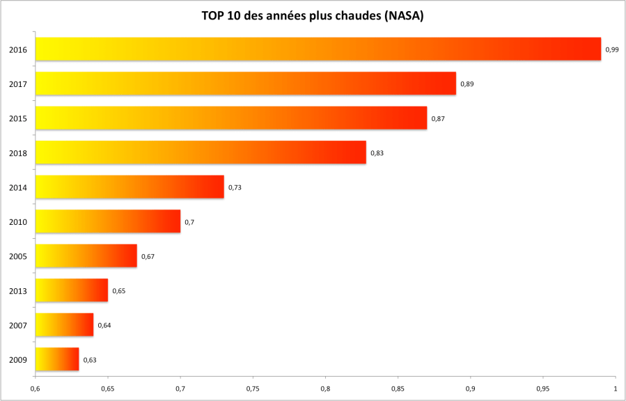 Les chiffres publiés par la NASA sont relatifs à la période 1951-1980 mais on peut aussi calculer les anomalies par rapport aux données les plus lointaines, à savoir la période 1880-1899, que l’on peut considérer comme représentative de l’ère préindustrielle, où au moins comme une période où les émissions de gaz à effet de serre anthropiques n’avaient pas encore profondément modifié le climat. Cela permet de comparer la situation actuelle aux objectifs que sont fixés les Etats pour contenir le réchauffement climatique en-dessous du niveau considéré comme dangereux. Par rapport à la période 1880-1899, l’anomalie a été de 1,05°C en mai 2018. Lors de la COP21 de Paris, un accord a été obtenu pour contenir le réchauffement sous les 2°C, voire 1,5°C si possible. Ce dernier niveau avait été dépassé en février 2016 avec +1,6°C.