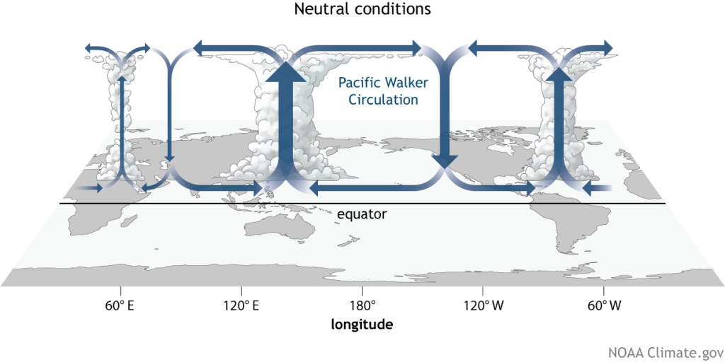 On peut voit ci-dessous la circulation de Walker dans des conditions neutres, avec une région de convection dans l’Atlantique et un mouvement descendant sur le Pacifique oriental, impliqué dans les vents d’est, les alizés.