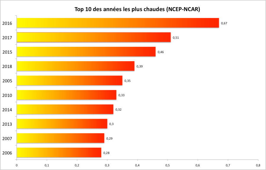 Le top 10 des années les plus chaudes. 2018 est limitée à janvier-juillet. D’après NCEP-NCAR.