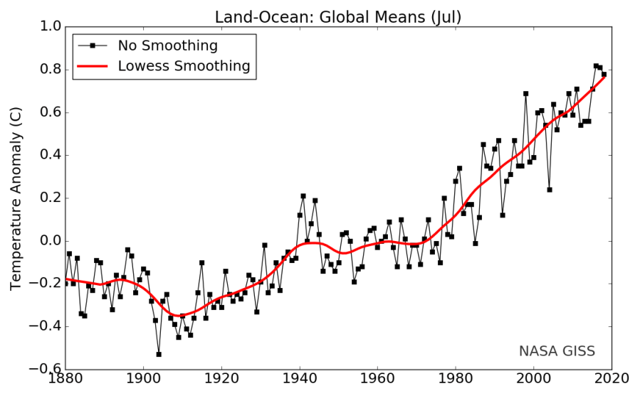 Les chiffres publiés par la NASA sont relatifs à la période 1951-1980 mais on peut aussi calculer les anomalies par rapport aux données les plus lointaines, à savoir la période 1880-1899, que l’on peut considérer comme représentative de l’ère préindustrielle, où au moins comme une période où les émissions de gaz à effet de serre anthropiques n’avaient pas encore profondément modifié le climat. Cela permet de comparer la situation actuelle aux objectifs que sont fixés les Etats pour contenir le réchauffement climatique en-dessous du niveau considéré comme dangereux. Par rapport à la période 1880-1899, l’anomalie a été de +0,97°C en juillet 2018. Lors de la COP21 de Paris, un accord a été obtenu pour contenir le réchauffement sous les 2°C, voire 1,5°C si possible. Ce dernier niveau avait été dépassé en février 2016 avec +1,6°C.