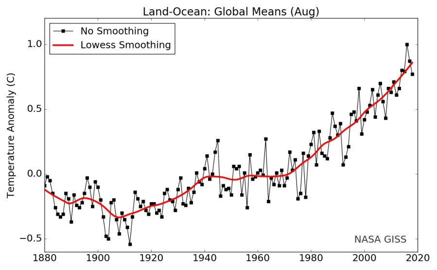 Les chiffres publiés par la NASA sont relatifs à la période 1951-1980 mais on peut aussi calculer les anomalies par rapport aux données les plus lointaines, à savoir la période 1880-1899, que l’on peut considérer comme représentative de l’ère préindustrielle, où au moins comme une période où les émissions de gaz à effet de serre anthropiques n’avaient pas encore profondément modifié le climat. Cela permet de comparer la situation actuelle aux objectifs que sont fixés les Etats pour contenir le réchauffement climatique en-dessous du niveau considéré comme dangereux. Par rapport à la période 1880-1899, l’anomalie a été de +0,955°C en août 2018. Lors de la COP21 de Paris, un accord a été obtenu pour contenir le réchauffement sous les 2°C, voire 1,5°C si possible. Ce dernier niveau avait été dépassé en février 2016 avec +1,6°C.