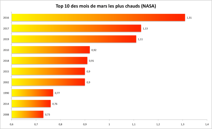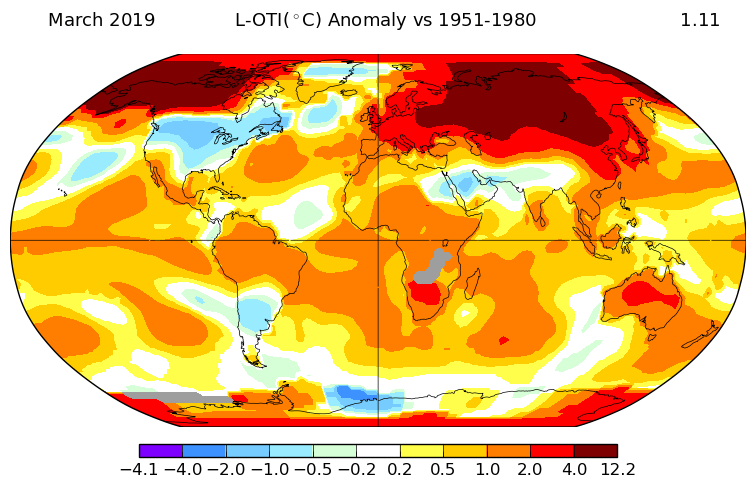 Le mois de mars 2019 a été le troisième plus chaud depuis le début des relevés de la NASA en 1880.