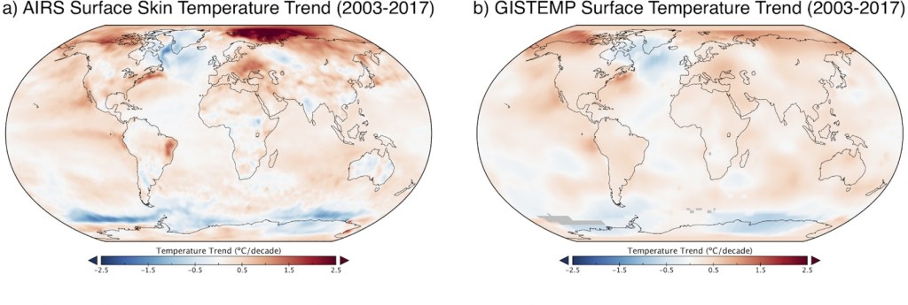 Une nouvelle étude publiée par Joel Susskind et Gavin Schmidt, de la NASA, montre les résultats des mesures de la température de surface la Terre prises par un système de mesure infrarouge par satellite appelé AIRS (sondeur infrarouge atmosphérique) de 2003 à 2017.