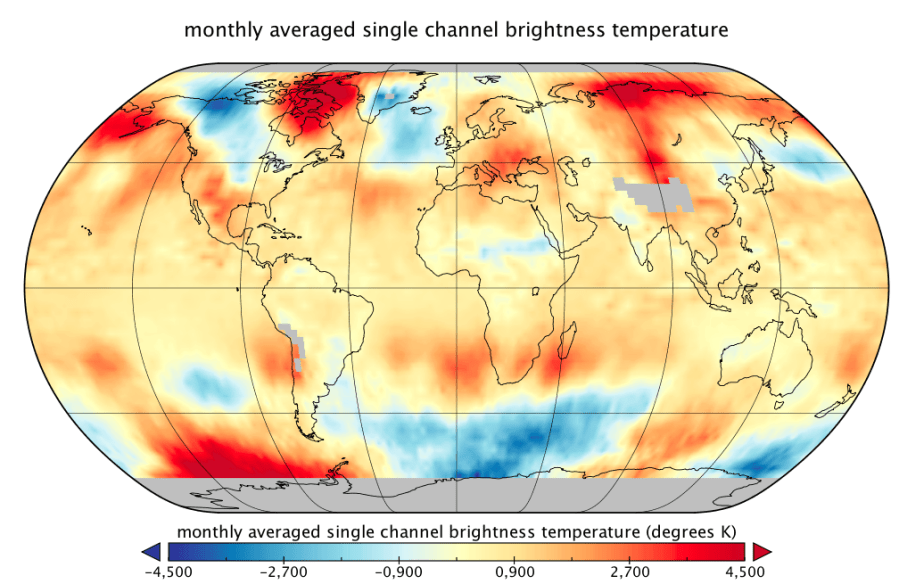 Les satellites utilisés par RSS ne mesurent pas directement la température à la surface du sol, mais interprètent la température de la basse troposphère. Des sondeurs sont capables de récupérer les profils de température verticaux de l’atmosphère en mesurant l’émission thermique de molécules d’oxygène à différentes fréquences.