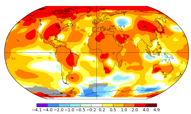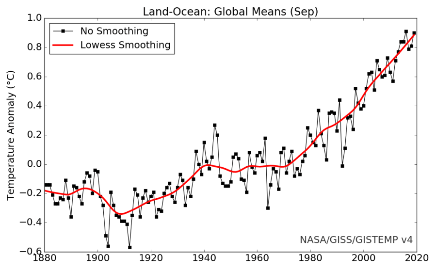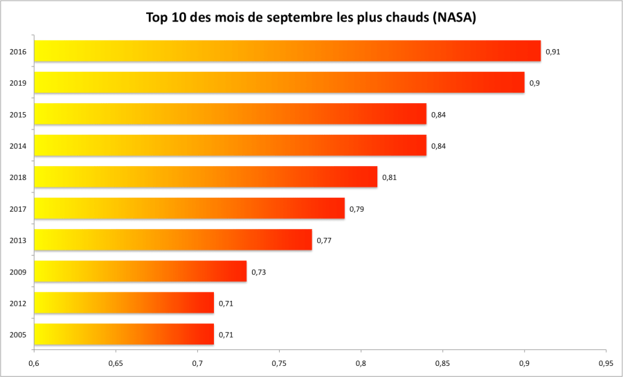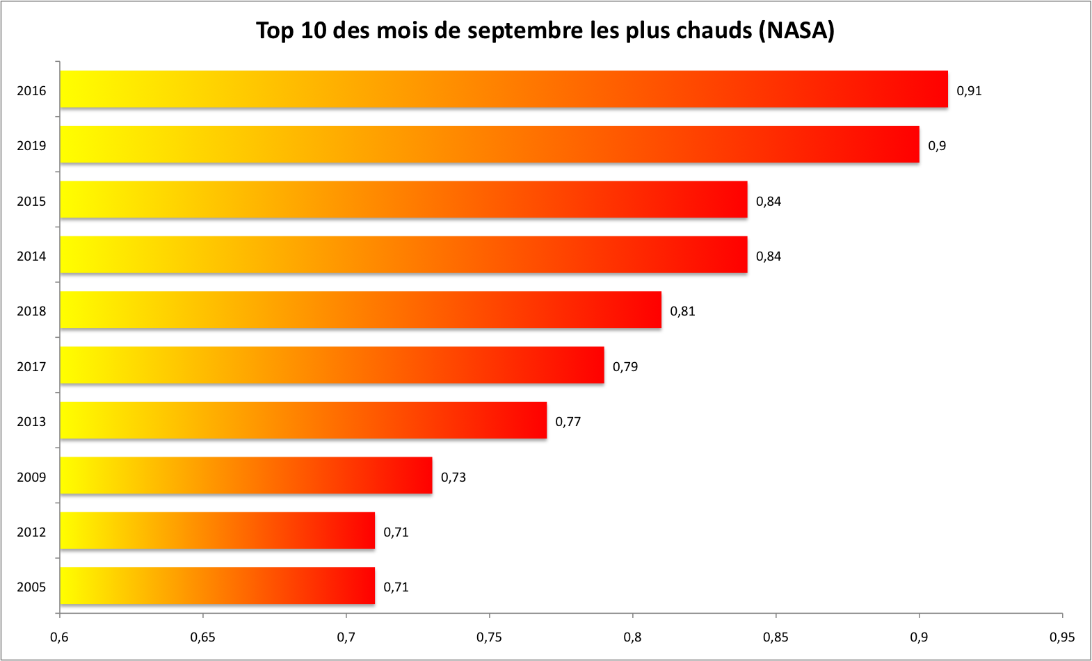 Avec +0,90°C au-dessus de la moyenne 1951-1980, l’anomalie relevée en septembre 2019 est la 2e plus élevée des annales, d’après la NASA.