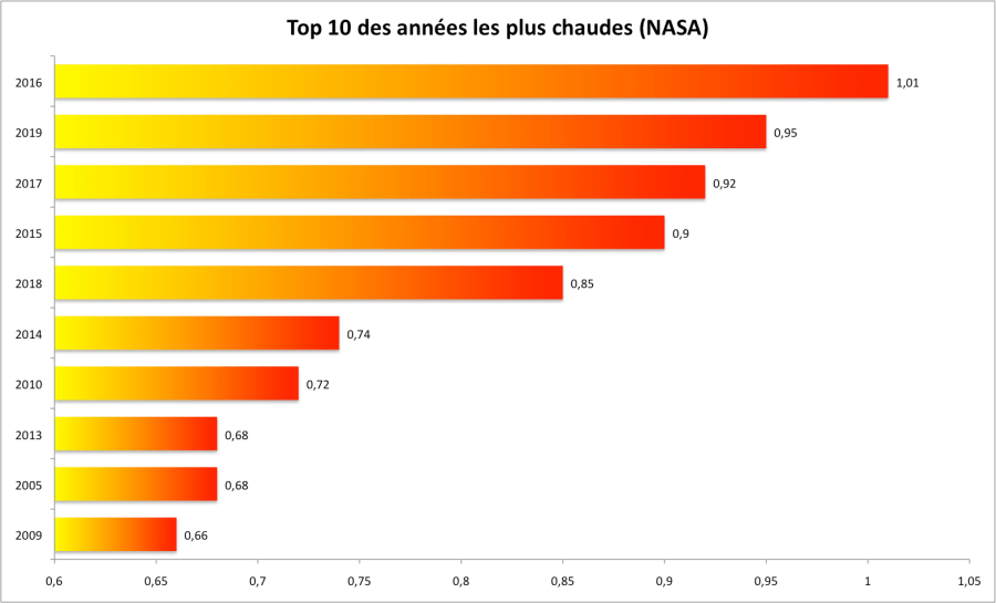 Les chiffres publiés par la NASA sont relatifs à la période 1951-1980 mais on peut aussi calculer les anomalies par rapport aux données les plus lointaines, à savoir la période 1880-1920, une période où les émissions de gaz à effet de serre anthropiques n’avaient pas encore profondément modifié le climat.