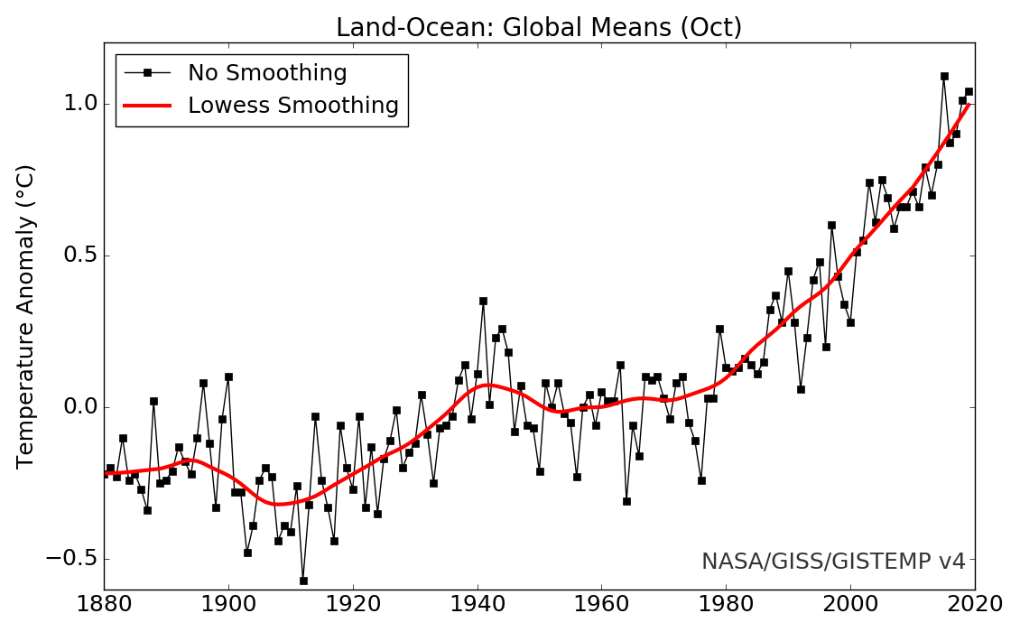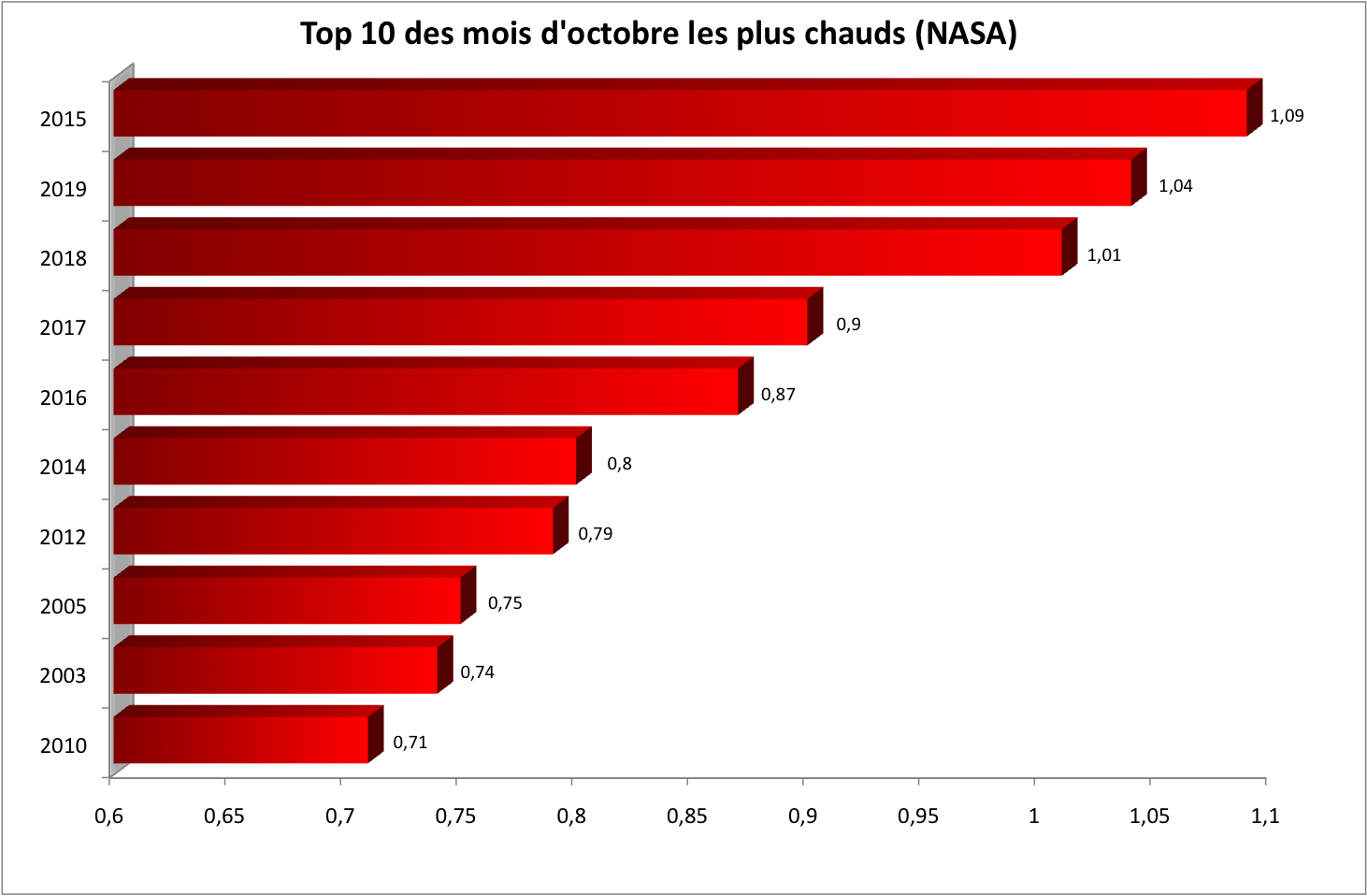 Avec +1,04°C au-dessus de la moyenne 1951-1980, l’anomalie relevée en octobre 2019 est la 2e plus élevée des annales, d’après la NASA. Les anomalies sont surtout importantes dans l’hémisphère nord, qui n’a jamais été aussi chaud en octobre.